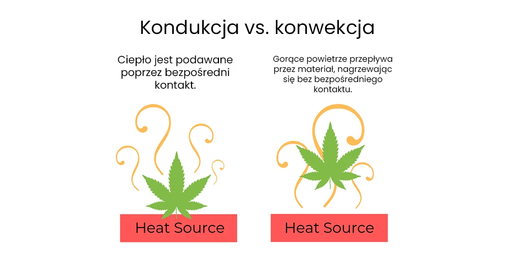 Kondukcja: W tej metodzie ciepło jest bezpośrednio przekazywane do materiału roślinnego poprzez kontakt z komorą grzewczą. Podgrzany materiał odparowuje aktywne związki, które są wdychane przez ustnik. Metoda ta działa natychmiast, ale może prowadzić do nierównomiernego ogrzewania suszu.